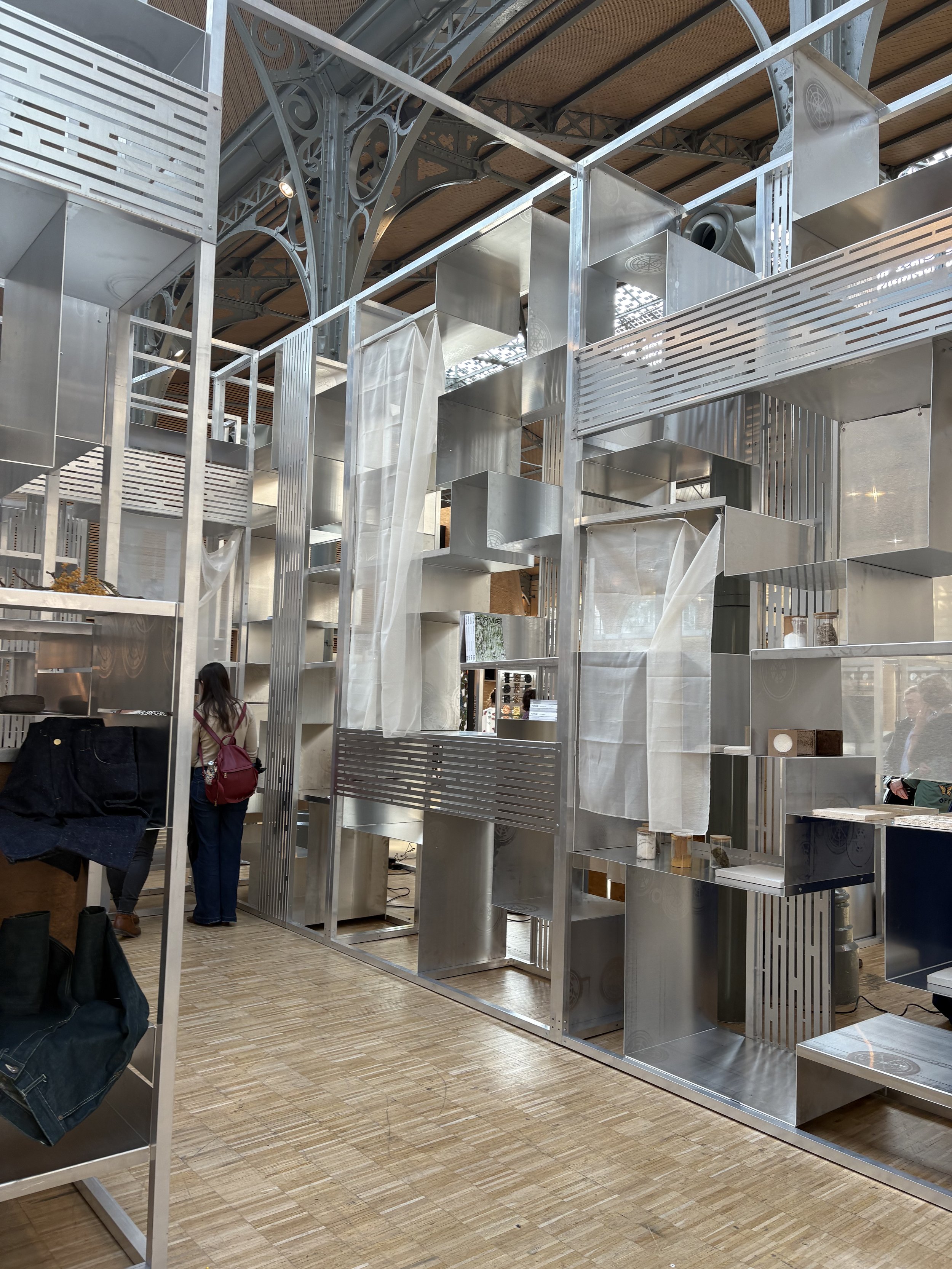 My role in this project involved cutting the various draped textile panels according to the precise measurements indicated on the plans provided by the architects. I also guided the team to suggest the best finishing techniques and attachment solutions for the metal structure. Once the panels were prepared, we traveled to Paris to install the different draped textiles on the structure, ensuring a precise and aesthetically pleasing result.